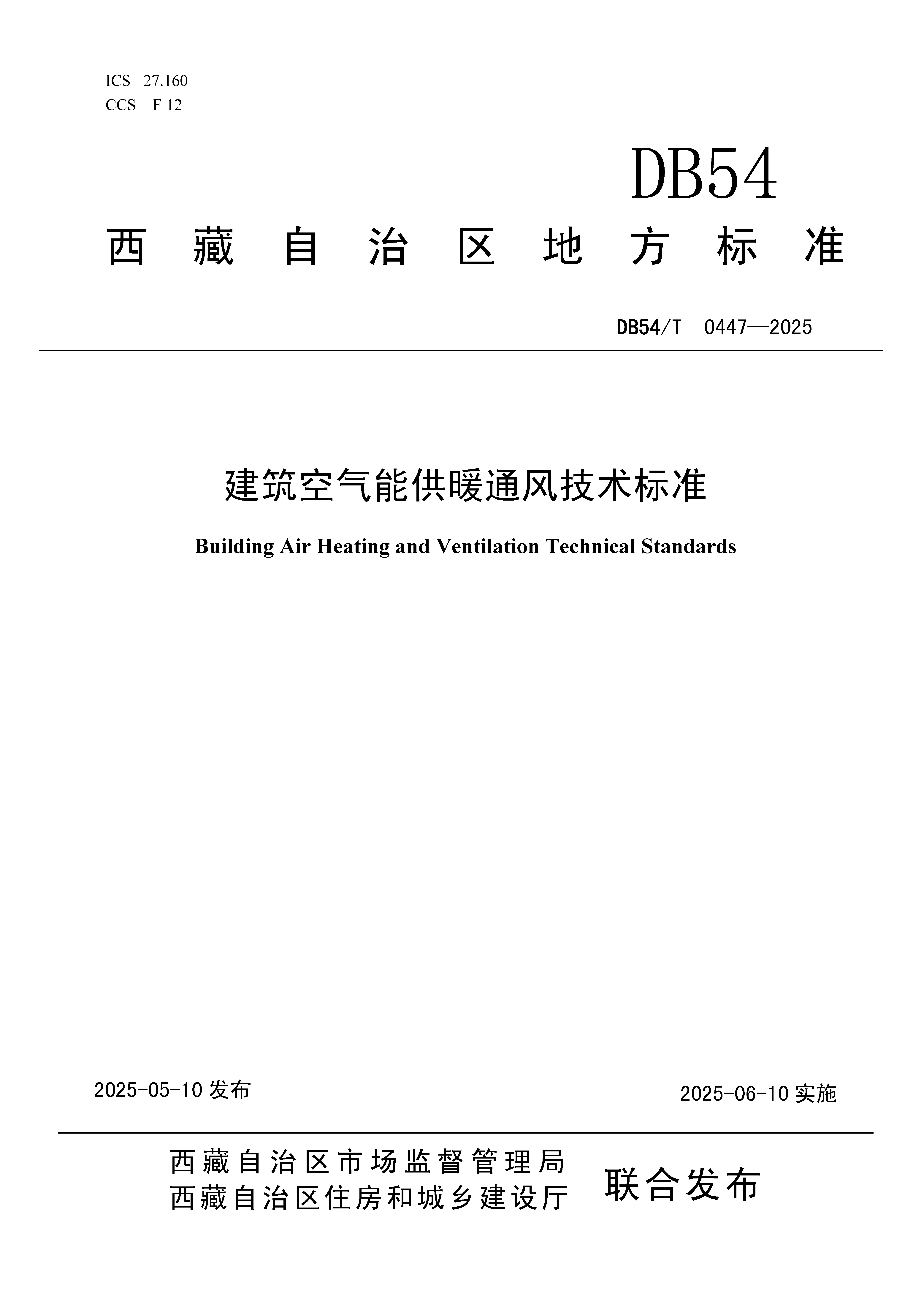 由我校Beat365官方网站黄翔教授团队主编的西藏自治区地方标准《建筑空气能供暖通风技术标准》(DB54/T 0447—2025)正式发布,于2025年6月10日开始实施。