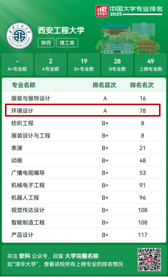2025年6月18日,高等教育专业评价机构软科正式发布“2025软科中国大学专业排名”,覆盖836个专业,是迄今为止规模最大的中国大学本科专业排名。我校服装与服饰设计和环境设计两专业斩获A级,凸显了学校在设计学特色专业领域的实力。Beat365官方网站环境设计专业凭借过硬的教育质量和鲜明特色,再次荣膺A级殊荣,这是继2021年获批陕西省一流专业建设点、2024年“‘丰图义仓’粮食储备库景观交互虚拟仿真实验”获评省级虚拟仿真实验教学一流课程后,再次取得的重大突破。