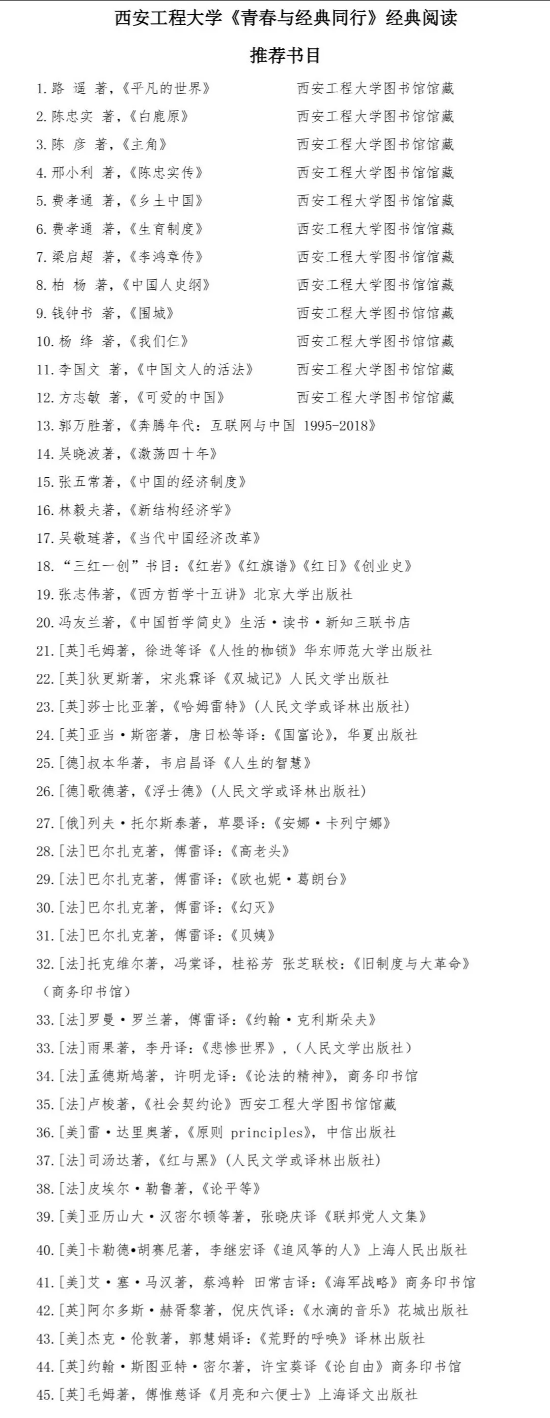1.学校在“西工程大青年”APP上发起实施相关第二课堂教育项目,学院2017、2018、2019级学生通读校图书馆编辑的《青春与经典同行》推荐书目或其他文史哲学书籍;