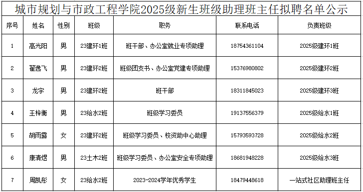 为进一步加强学院学风建设,推进学院学生“自我教育、自我管理、自我服务、自我监督”四自体系建设,做好学生“高带低”、“传帮带”工作。经学生自主申报、班级推荐、学工办考察研究,拟聘以下7位2023级优秀学生、学生干部担任学院2025级新生助理班主任和“一站式”学生社区助理班主任,公示名单如下: