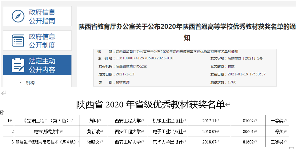 近日,陕西省教育厅印发《关于公布2020年陕西普通高等学校优秀教材获奖名单的通知》(陕教高办〔2021〕1号),Beat365官方网站黄翔教授主编的《空调工程》(第3版)获得省级优秀教材一等奖。