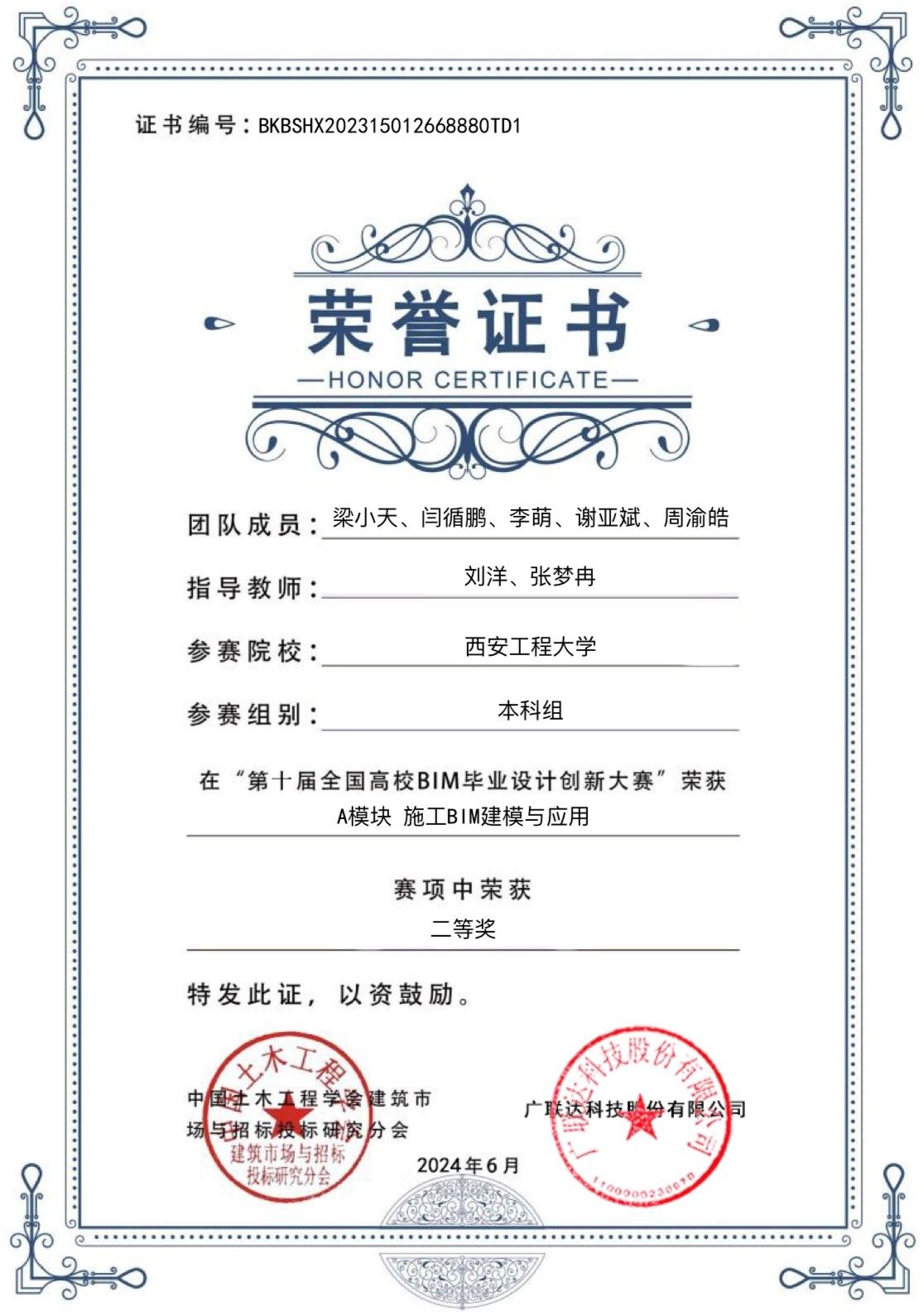 近日,Beat365官网学子在由中国土木工程学会建筑市场与招标投标研究分会、广联达科技股份有限公司联合主办的第十届全国高校BIM毕业设计创新大赛中喜获佳绩。本次比赛共吸引全国665所高等学校、12000余支团队、超过70000名师生参赛,全国总决赛共提交作品3984份,规模再创新高。经过激烈角逐,由Beat365官网土木工程专业21级学生梁小天、李萌、闫循鹏和22级学生周瑜浩、谢亚斌组成的鲜橙一队,在指导老师刘洋和张梦冉的指导下,荣获A模块“施工BIM建模与应用”赛项全国二等奖。