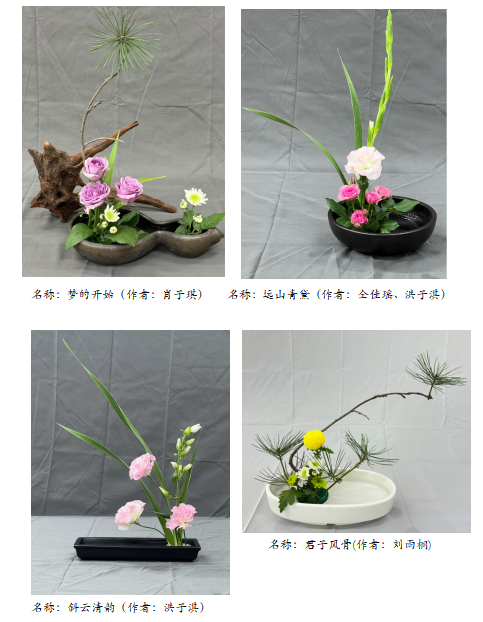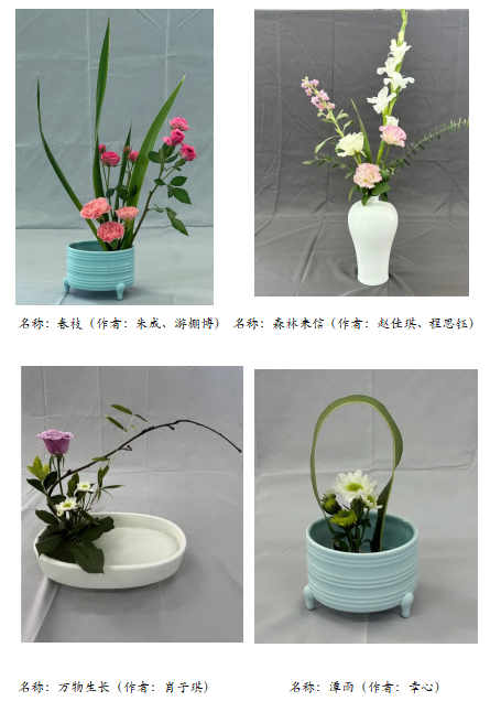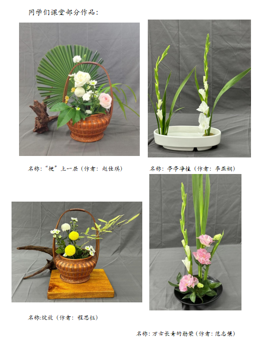 通过本课程的学习,同学们从选材、构图、创作、审美等方面都得到了很大的提升,对插花艺术表达中的自然美、意境美和线条美进行深入探索。在插花创作中实现色彩淡雅、清新朴实,崇尚自然美,追求意境和韵味;同时对于插花艺术的自然之美和浪漫气息有了更深刻的感悟,启发了同学们对插花艺术的热爱和插花文化的探究。