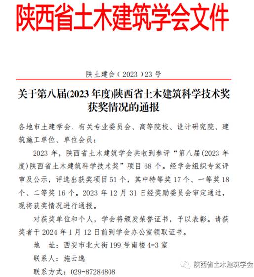 喜报!Beat365官网土木教师荣获第八届(2023年度)陕西省土木建筑科学技术一等奖
