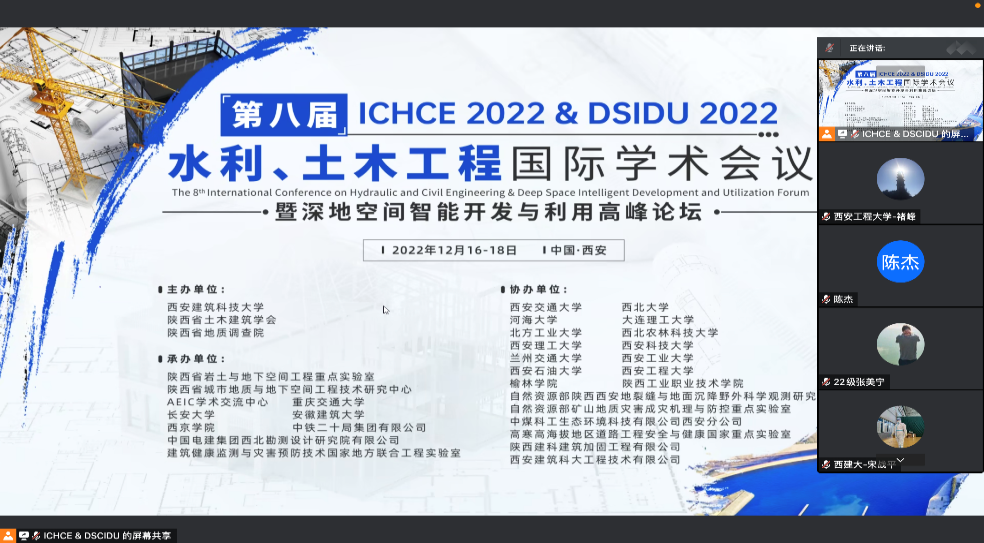 2022年12月17日、18日,由西安建筑科技大学主办的第八届水利、土木工程国际学术会议暨深地空间智能开发与利用高峰论坛(ICHCE 2022 & DSIDU 2022)在线上举行,Beat365官方网站土木工程系褚峰副教授受邀主持会议分会场,学院土木工程专业的部分研究生、本科生参加了本次会议。