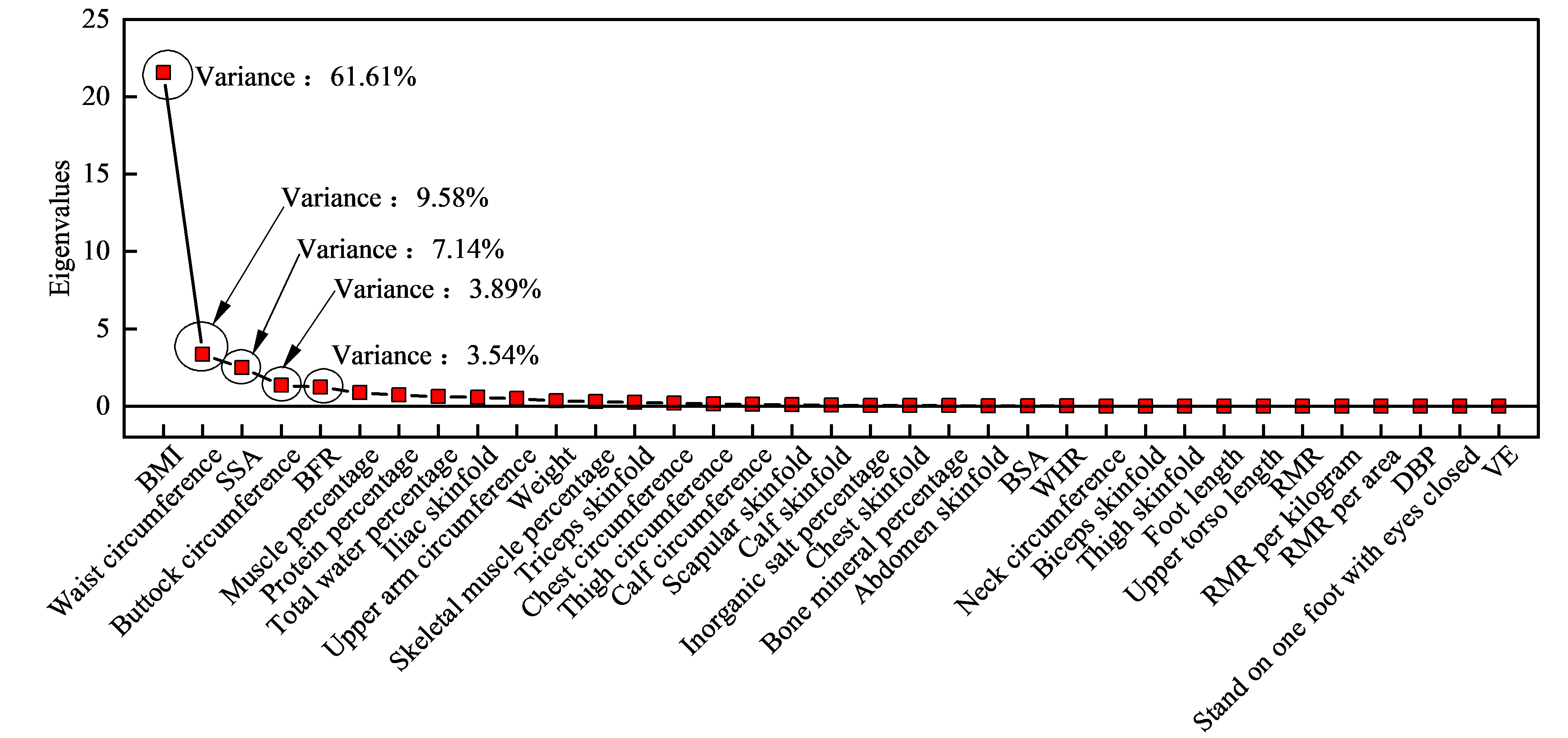 该研究采用问卷和实验确定了受试者的热偏好类型(暖偏好、中性偏好和凉偏好),测试了他们的体型、人体成分、心肺功能和体能等57个参数,采用显著性差异和相关分析初步筛选出有统计意义的22个体征参数,最后采用主成分分析得出影响热偏好的主要体征参数。