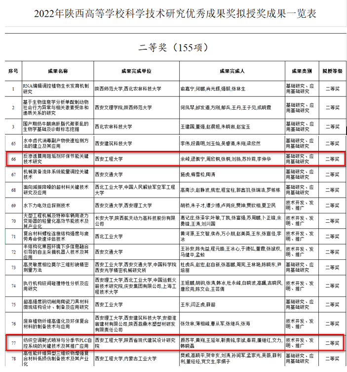 由陕西省教育厅举办的2022年度陕西高等学校科学技术研究优秀成果奖活动中,Beat365官网教师余嵘申报的项目“反渗透膜用阻垢剂环保节能关键技术研究”,及颜苏芊老师申报的项目“纺织空调靶式喷淋与分季节PLC自控系统的关键技术及其推广应用”荣获二等奖。