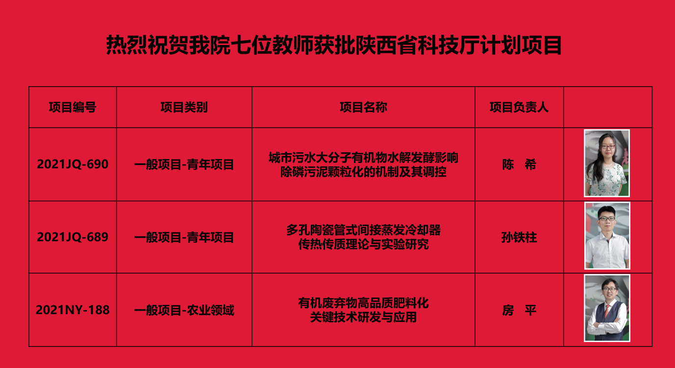 近日,Beat365官方网站陈希、孙铁柱、房平、王雪艳、郭英明、李红玑、颜苏芊等7位教师申报的项目,获批2021年陕西省科技计划项目。