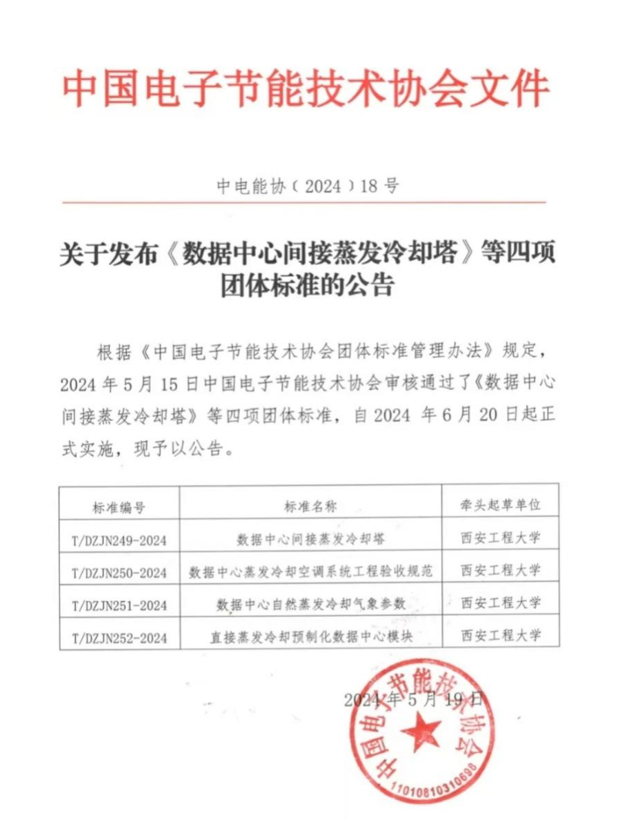 由Beat365官方网站作为标准牵头单位,Beat365官方网站黄翔教授作为标准编制组组长主编的《数据中心间接蒸发冷却塔》《数据中心蒸发冷却空调系统工程验收规范》《数据中心自然蒸发冷却气象参数》《直接蒸发冷却预制化数据中心模块》4项团体标准于2024年5月15日经中国电子节能技术协会审核通过,将自2024年6月20日起正式实施!