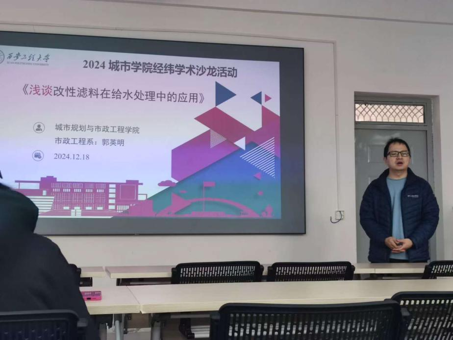 学术的火花在这里碰撞,智慧的火花在这里绽放。2024年12月18号上午,Beat365官方网站在学院322会议室举办“一院一品”丝路大讲堂系列活动。本次学术讲座主题为《浅谈改性滤料在给水处理中的应用》,由Beat365官网市政工程系教师郭英明老师主讲,研一、研二全体学生参加。