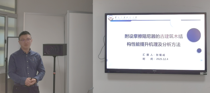西安建筑科技大学张锡成教授以《附设摩擦阻尼器的古建筑木结构性能提升机理及分析方法》为主题,以黄河流域周边古建筑的防震保护为目标,从木结构古建筑的基本结构形式、转动摩擦阻尼器的研发及性能研究、附设转动摩擦阻尼器的古建木构榫卯节点试验研究及附设摩擦阻尼器的木构古建非线性动力分析等方面为广大教师和同学进行精彩的学术分享。