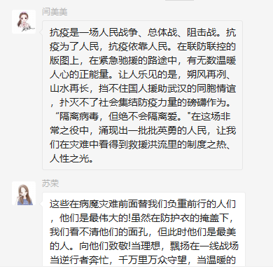 蒲紫夜在本次会议中,积极参加讨论:我们泪目不是被困难吓到,更多的是因为白衣天使带给了我们希望。对此次疫情逆行者献以诚挚感恩以及致以最高敬意。