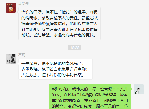 最后,支部书记张苹老师总结发言,感谢我们每位同学。“哪有什么岁月静好,只不过是有人替我们负重前行”。一位党员就是一面旗帜,作为党员的我们,更应勇于担当,扛起肩上的担当与责任。我们都是中华儿女这个大家庭的一员,我们与这个大家庭的每一份子同在,众志成城,祝愿早日战胜疫情!早日迎来春暧花开!