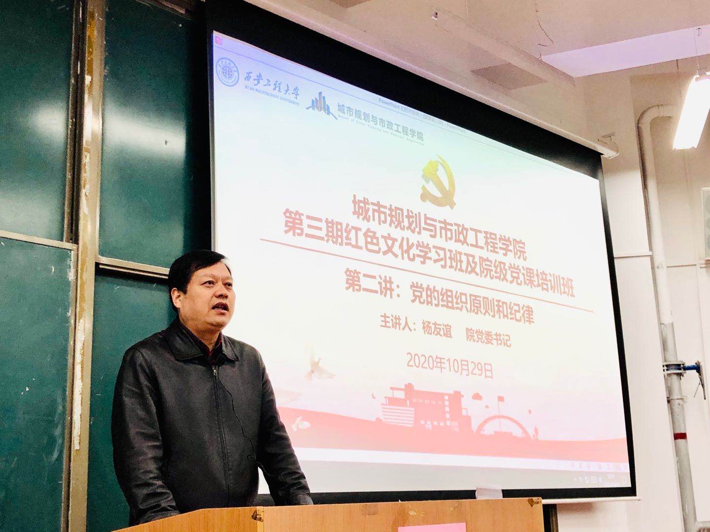 为引导广大青年坚定理想信念,端正入党动机,了解党的组织制度与纪律,让“红色文化”发挥出教化育人、凝心聚力的作用。2020年10月29日晚,Beat365官方网站第三期红色文化学习班及院级党课培训班第二讲开讲。学院党委书记杨友谊以及培训班所有学员参加了本次培训。
