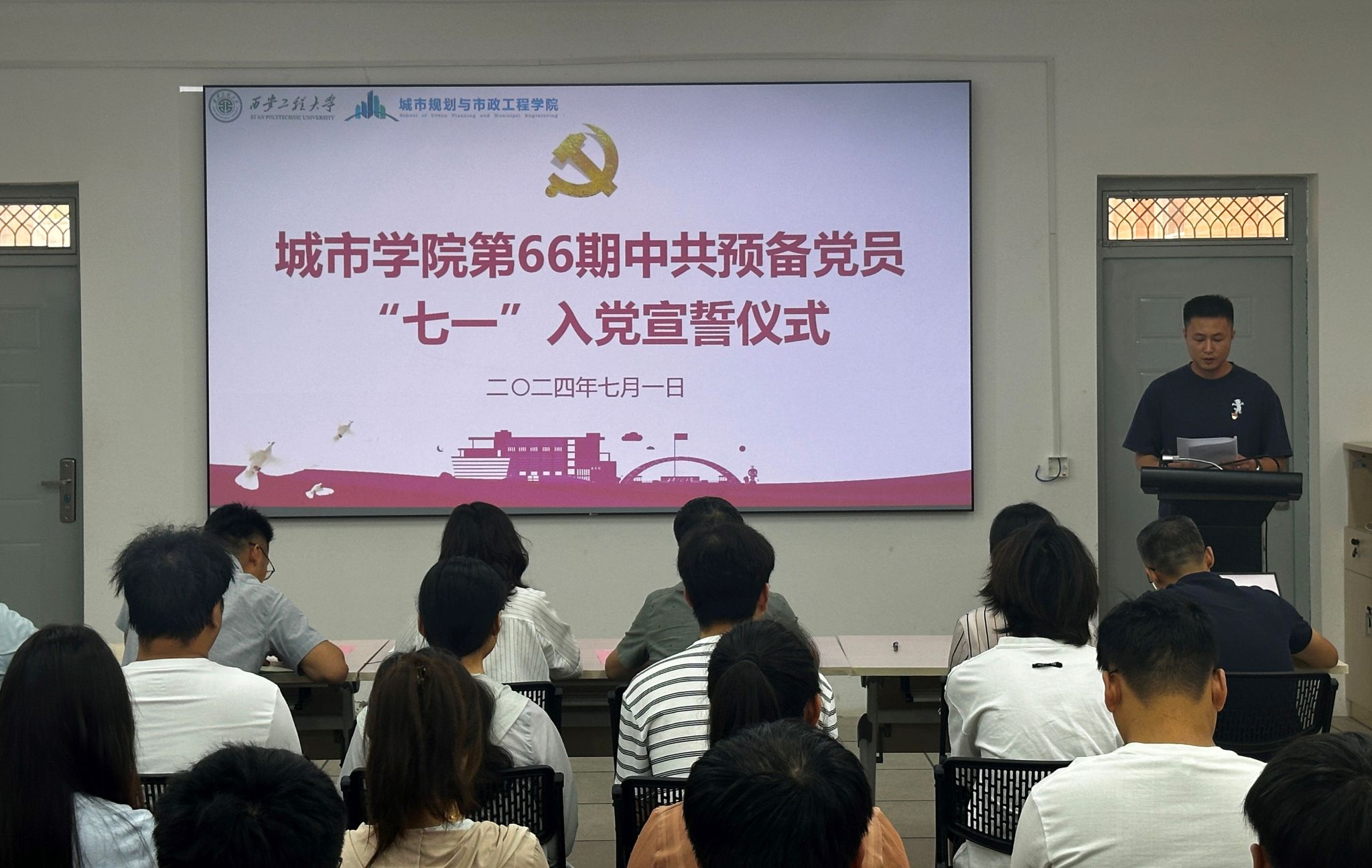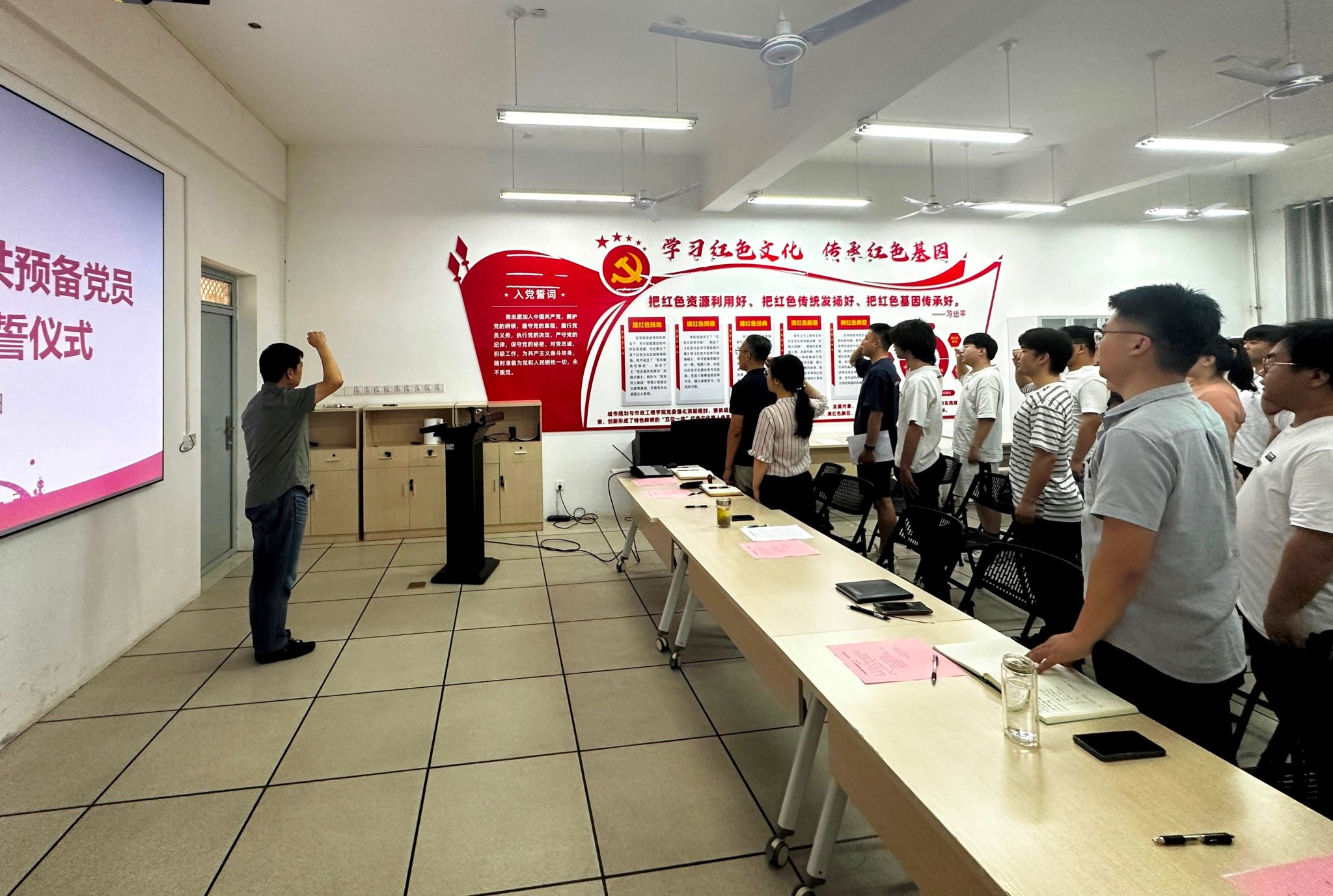 入党宣誓仪式在雄壮的《国际歌》声中拉开帷幕。宣誓仪式由学院党委书记王劲伟领誓,37名预备党员举起右手握拳,面向党旗庄严宣誓。