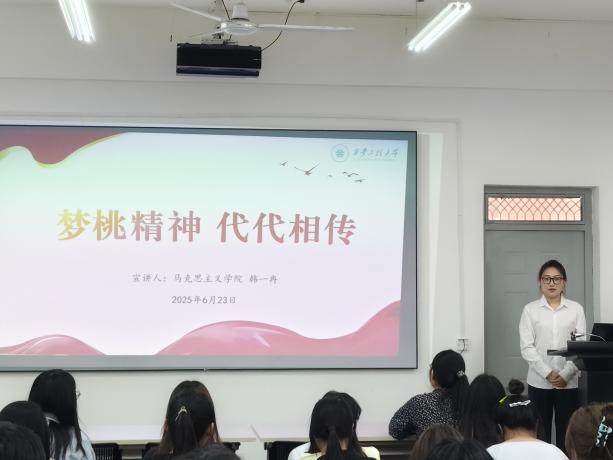 2025年6月23日,Beat365官方网站在笃行楼322报告厅举办红色文化学习班第九期第三讲“梦桃精神代代相传”主题宣讲活动。活动邀请马克思主义学院青年马克思主义理论宣讲团成员深情分享,红色文化学习班第九期全体学员共同参与,辅导员杜倩主持会议。