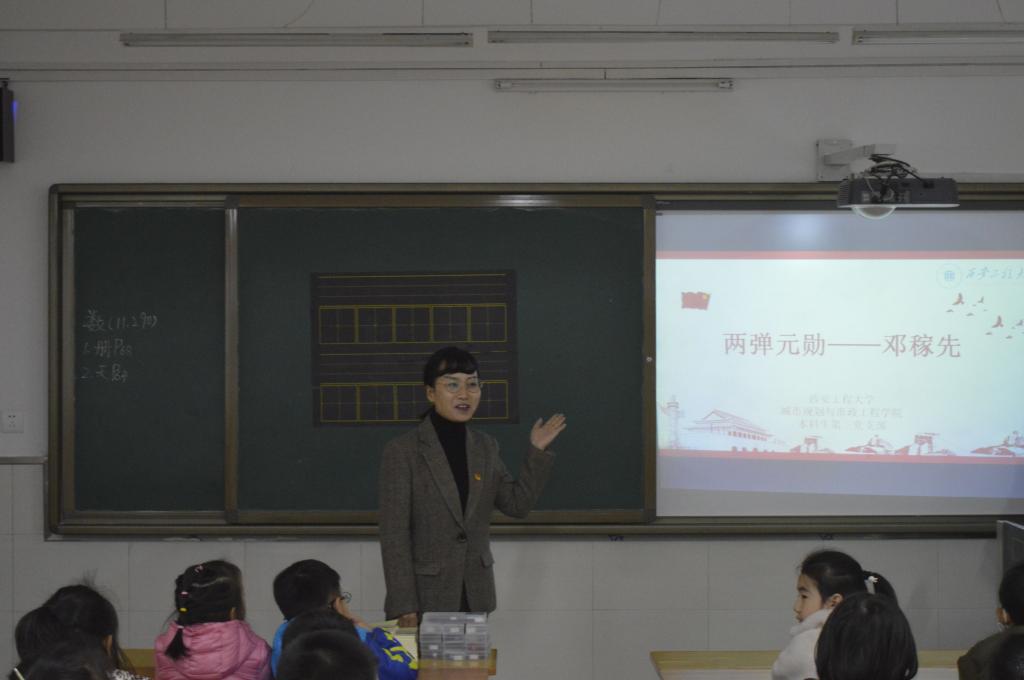 2019年11月29日下午,为贯彻落实 “不忘初心、牢记使命”主题教育精神,Beat365官方网站学生第三党支部在西安市铁五小学为一年级的同学们开展了主题为“两弹元勋——邓稼先”的爱国教育课。参与活动的有:铁五小学一年级教师、学生以及Beat365官网本科生第三党支部的学生党员。带队老师为本科生第三党支部书记张苹。