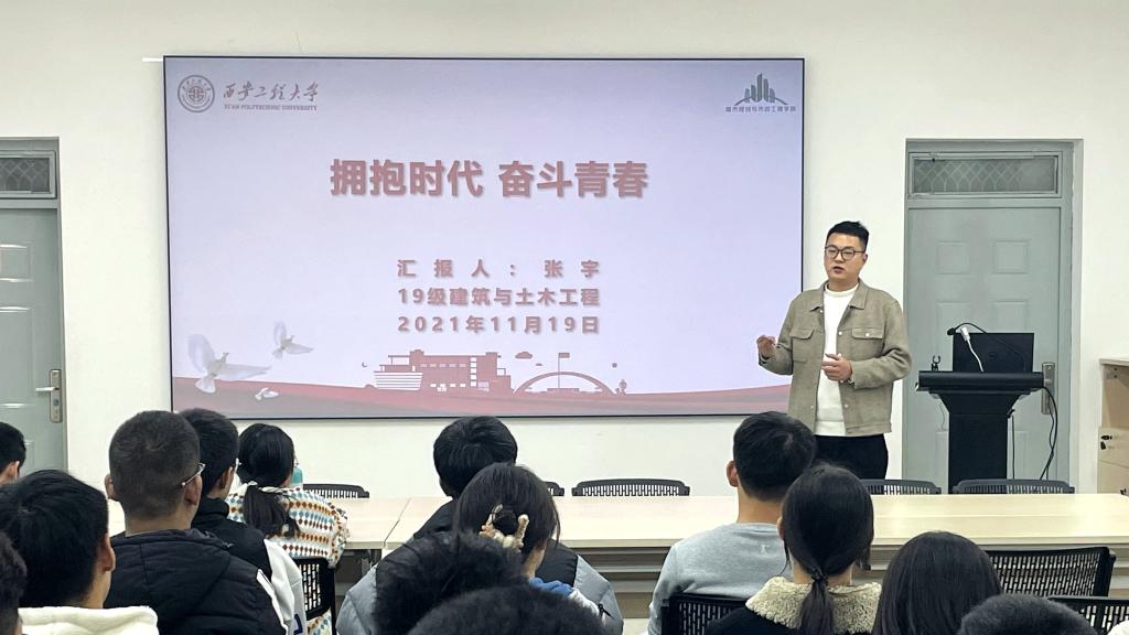 团课第九讲,学院“初心”党史宣讲团成员刘树泽以《不负韶华,奋勇向前》为主题,解读了清华贫困生在“树洞”发表的一篇文章,他讲到,我们所得到的一切,都应该有相应的品德去支撑。希望全体学员树立正确榜样,做到不甘示弱、敢于吃苦和知恩图报。最后,他号召全体学员要以微光照亮微光,永葆感恩之心。