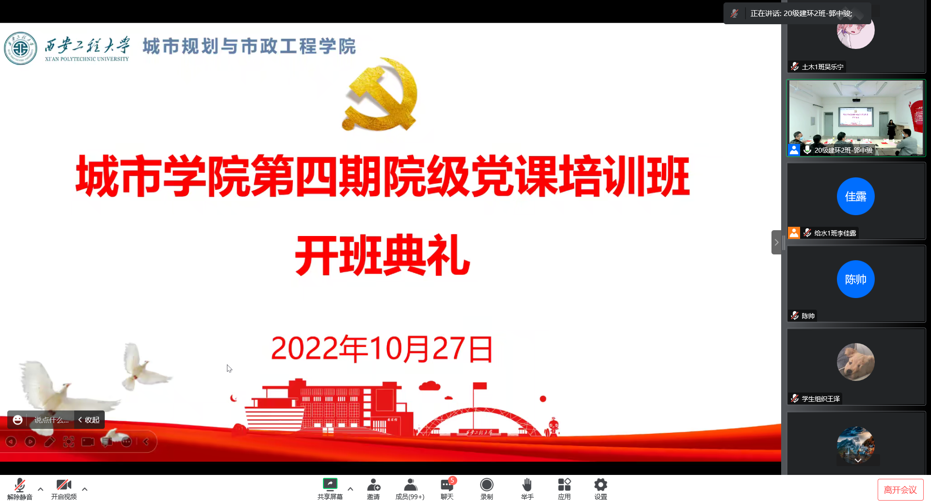2022年10月27日下午,Beat365官方网站第四期院级党课开班仪式在临潼校区8-322会议室通过线上线下相结合的方式顺利举行。参加开班仪式的有学院党委书记王劲伟,辅导员张苹、陆瑞成、王春元及255名培训班学员(其中包括55名第六期红色文化学习班学员)。仪式由学院党委副书记鱼园主持。