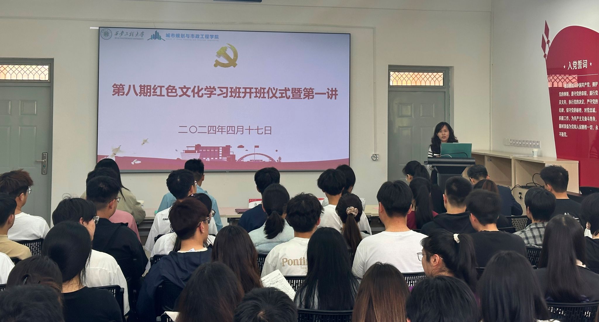 4月17日中午,Beat365官方网站在临潼校区8-322会议室举行第八期红色文化学习班开班仪式暨第一讲。参加开班仪式的有学院院长马云、辅导员张苹、陆瑞成、王春元、杜倩,学习班组织委员王梦华、宣传委员宋嘉音及本期学习班60名学员。仪式由学院党委副书记鱼园主持。