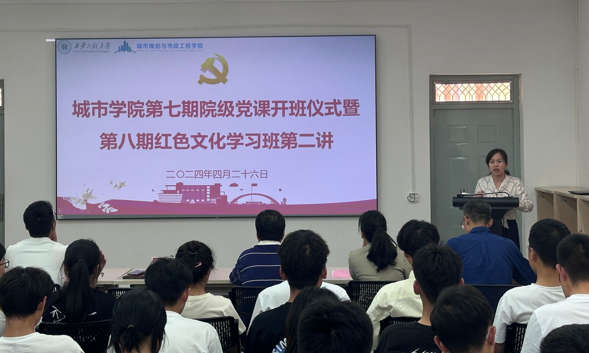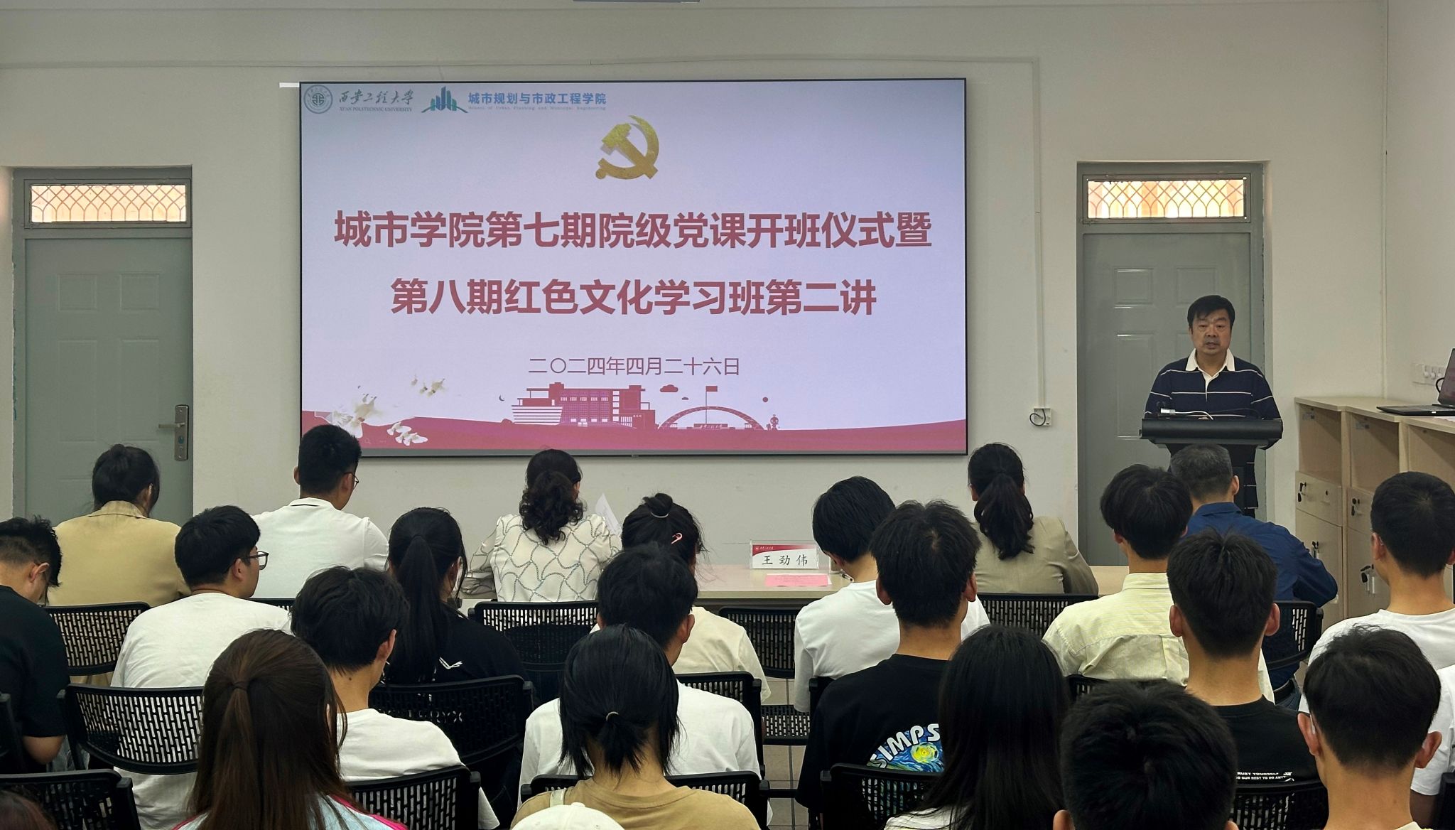 4月26日下午,Beat365官方网站第七期院级党课开班仪式暨第八期红色文化学习班第二讲在学院322报告厅顺利召开。参加开班仪式的有学院党委书记王劲伟、全体辅导员及培训班全体学员。开班仪式由学院党委副书记鱼园主持。