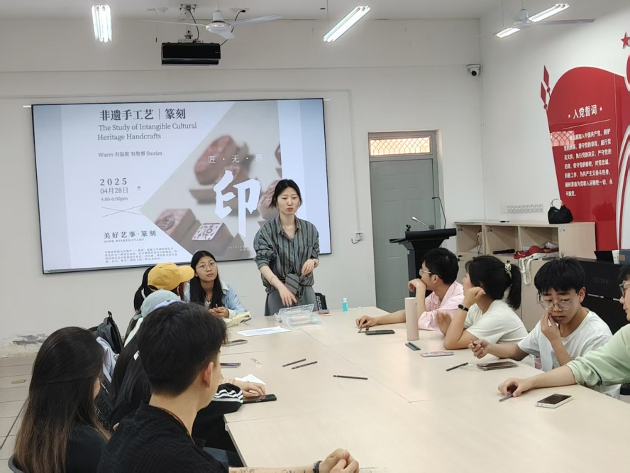 活动特邀李晨菲老师现场指导。李老师从篆刻的起源与发展讲起,深入剖析了其作为汉字艺术与金石文化载体的双重价值——“篆刻不仅是技艺的凝练,更是文人精神的物化”。现场,演示了选石、写稿、运刀等传统技法,同学们在老师指导下亲手挑选印石、设计印文,刻制出独具韵味的个人印章。过程中,老师还结合当代审美趋势,启发学生将传统篆刻与现代设计语言相融合,探索非遗文化的创新表达。