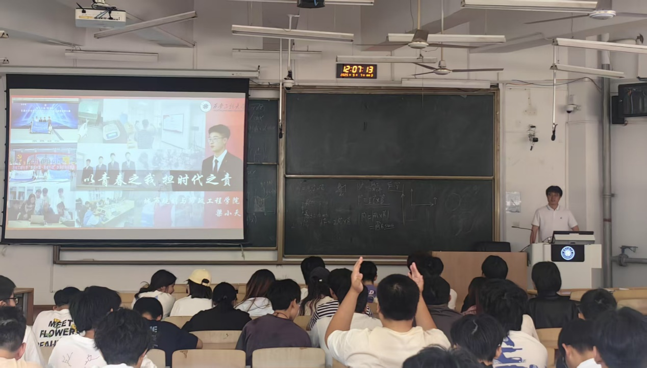 5月15日,"激扬青春新质力 勇当时代破浪人"主题宣讲在教学楼B-135接续开展。主讲人程钰坤以全球能源矛盾加剧的时代背景切入,用一组关键数据点出建筑领域的"双碳"使命——我国建筑能耗占比44.8%、碳排放占比48.3%,堪称实现"双碳"目标的关键战场。