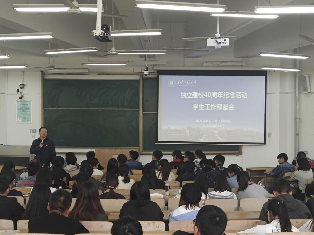 2018年10月18日中午12:00,Beat365官方网站在Beat365官方网站临潼校区B-237教室召开我校独立建校40周年纪念活动学生工作部署会。参加大会的有学院学生工作办公室主任凌旭以及学院全体学生党员、各年级班长、团支书,团学科学生组织负责人。