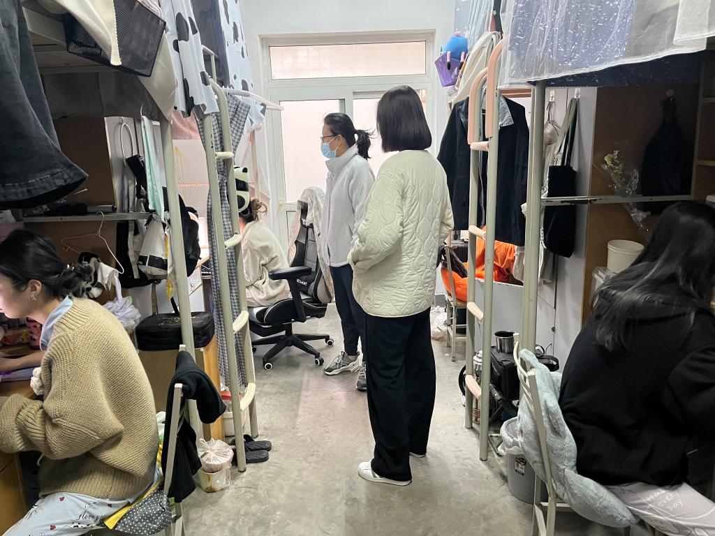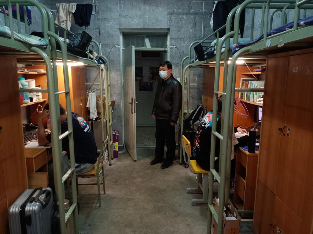 院长、书记一行分别来到3号楼女生宿舍以及5号楼和8号楼男生宿舍,全面了解线上课堂教学情况,现场检查学生线上学习情况,现场查看了学生宿舍卫生和防疫状况。