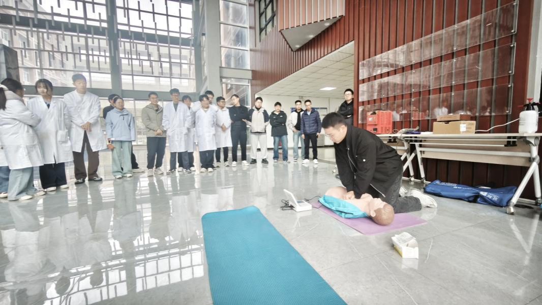 演练模拟了实验室因线路老化过载引发电器设备着火、人员在紧急断电时不幸触电昏迷的复杂场景。参演师生迅速反应,分工协作:安全转移伤员、规范切断总电源、及时上报事故。讲解员现场详细讲解了电器火灾扑救的步骤与禁忌。紧接着,利用硅胶假人和AED训练设备,专业人员分步骤演示了触电人员心肺复苏术(CPR)的操作流程、关键要点及AED的使用方法。在场师生纷纷上手实操,在专业指导下练习了胸外按压、人工呼吸及AED操作,切实提升了在突发状况下挽救生命的应急救护能力。