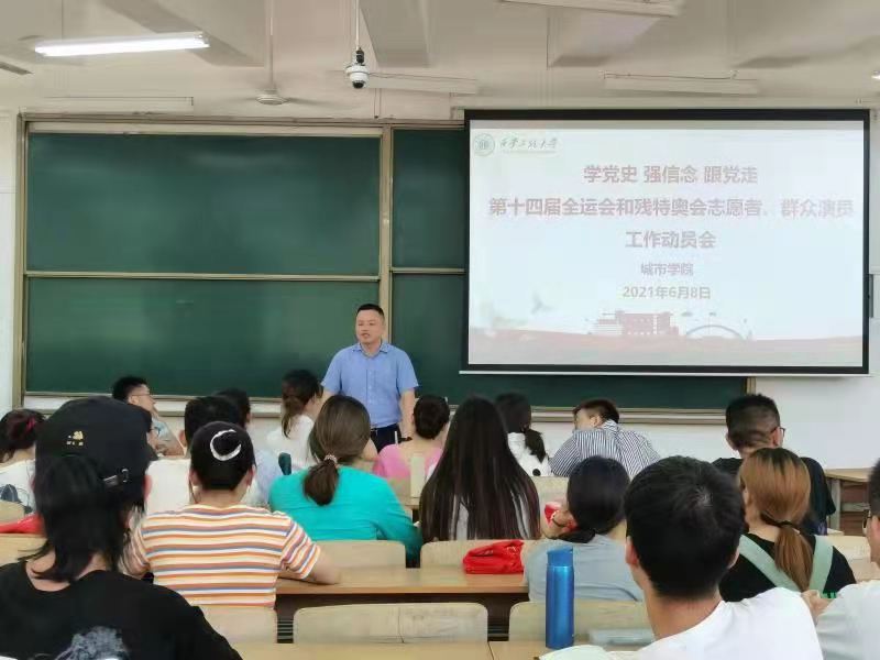 Beat365官方网站于6月8日中午在临潼校区B137教室召开第十四届全运会和残特奥会志愿者、群众演员工作动员会。学工办主任,团总支书记凌旭、辅导员陆瑞成以及学院全部志愿者,群众演员参加了大会。