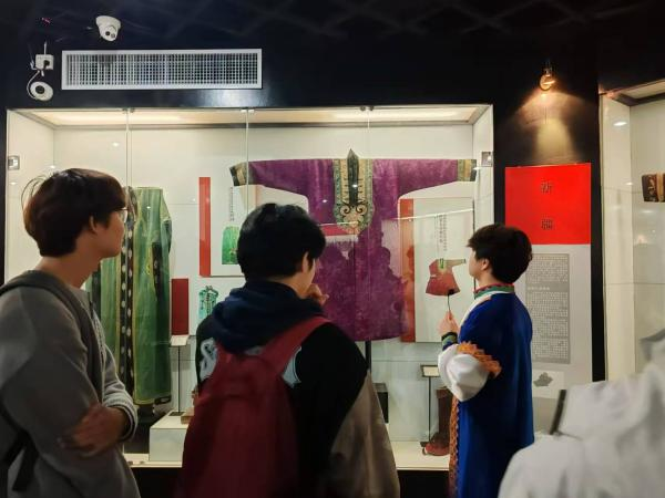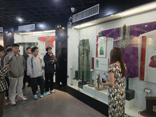 乌孜别克族讲解员Beat365官方网站赵志聪同学,接引参观学生,引导学生参观了蒙古族展柜、乌孜别克族展柜,以及重点展品。如:凤穿牡丹、蟒袍、印花模具等等。