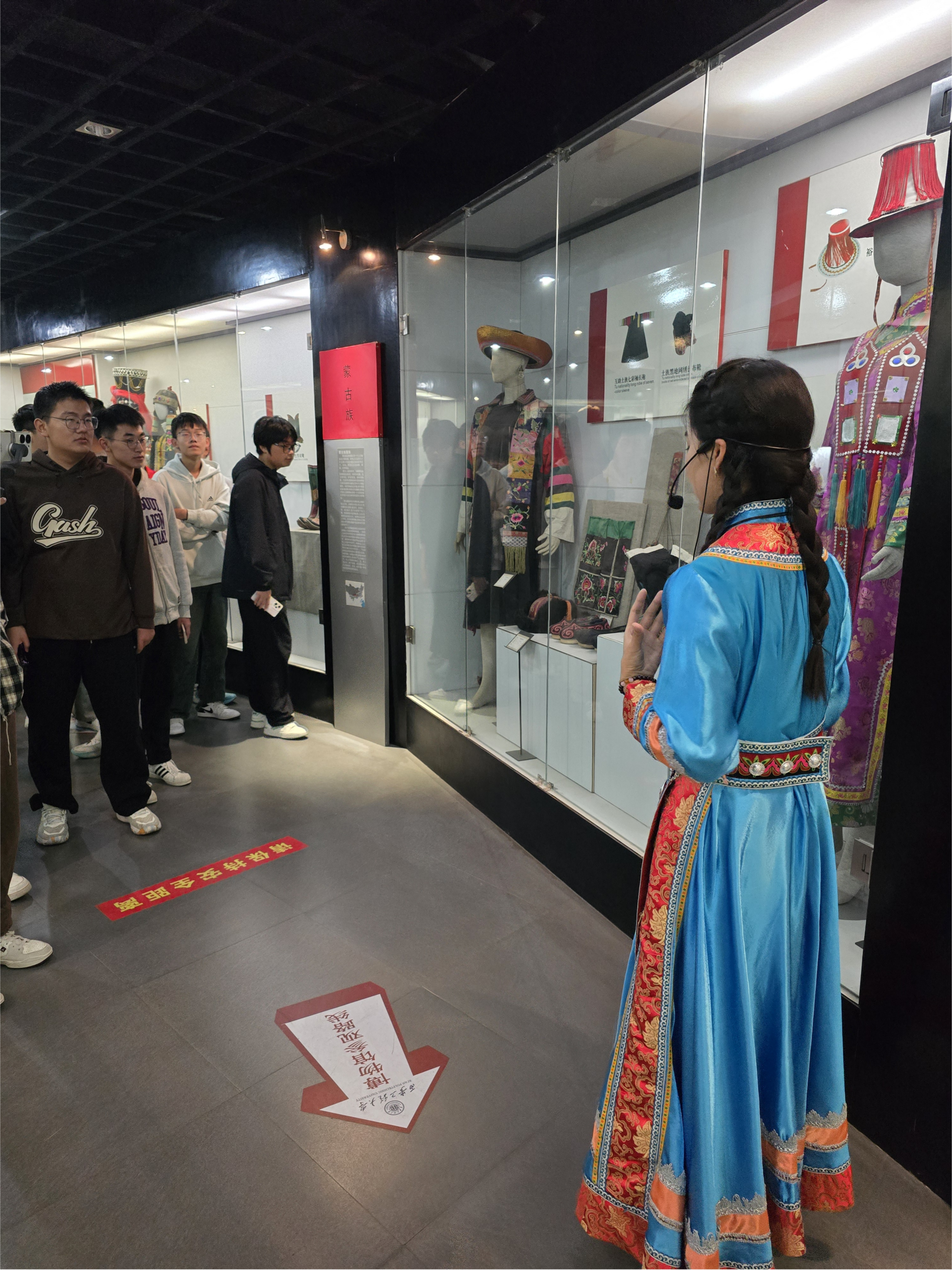 紧接着,大家来到裕固族的展柜。裕固族讲解员管理学院薛玲玲同学,她提到裕固族的服饰很有特点,他们的喇叭形尖顶红缨白毡帽是裕固族已婚妇女的标志性装束,帽顶上缀有红色的缨穗寓意英雄之血。