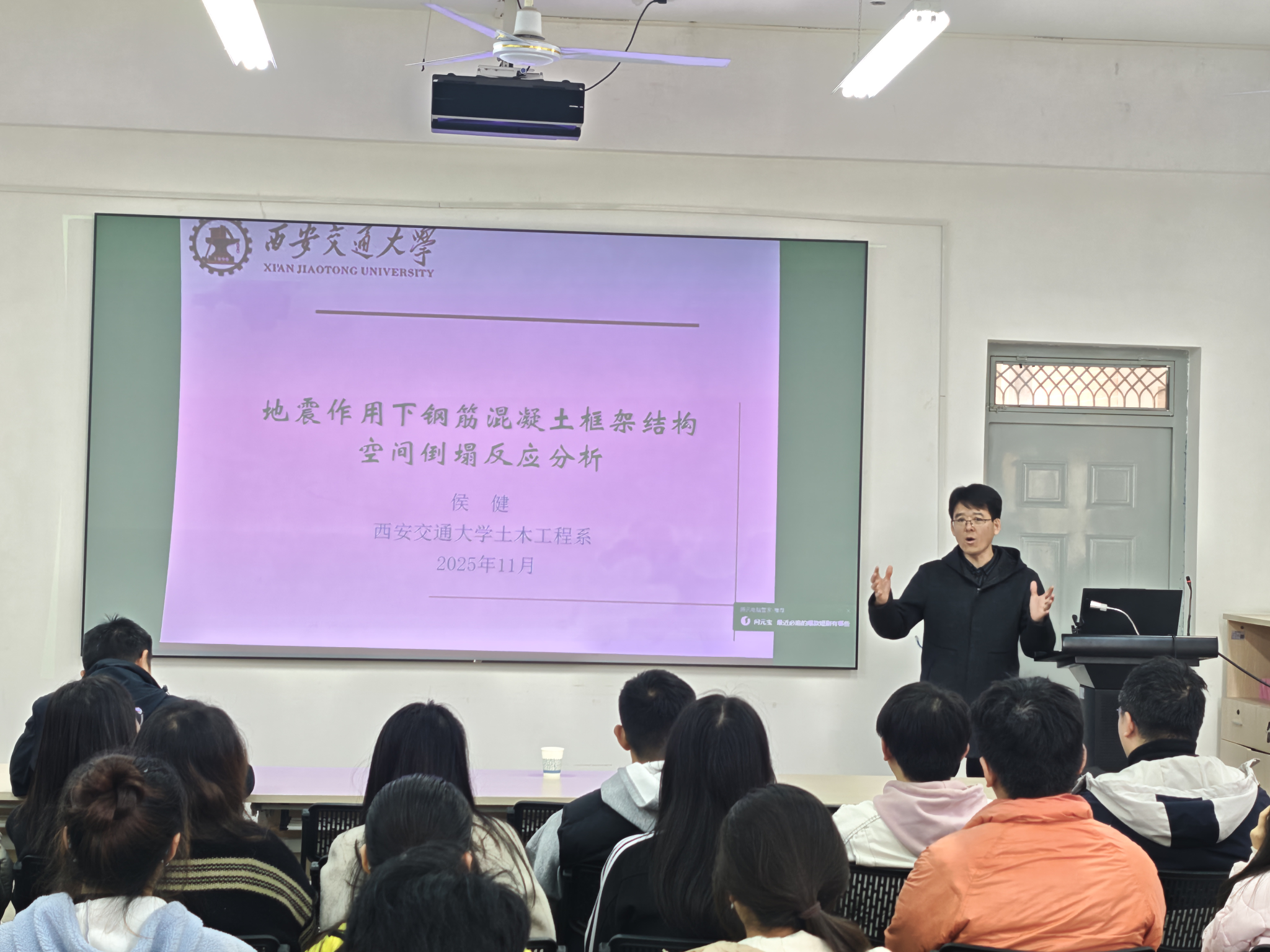 11月14日上午10时,Beat365官方网站Beat365官方网站“丝路大讲堂”第十一期学术报告在8-322报告厅顺利开讲。本次讲座特邀西安交通大学土木工程系侯健教授担任主讲,以《地震作用下钢筋混凝土框架结构空间倒塌反应分析》为题,为全院师生带来了一场聚焦结构抗震领域的前沿学术分享。