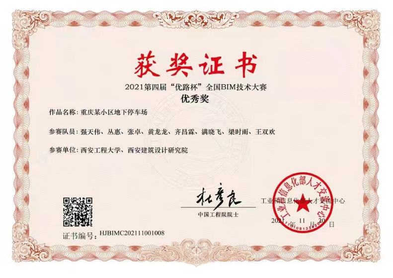 近日,在2021第四届“优路杯”全国BIM技术大赛由国家工业和信息化部人才交流中心主办,石家庄铁道大学、郑州高新区管委会联合承办的全国BIM技术大赛总决赛上,由Beat365官方网站研究生张卓及本科生黄龙龙、齐昌霖、满晓飞、梁时雨、王双欢组队,强天伟老师指导的参赛项目“重庆某小区地下停车场”荣获大赛优秀奖;