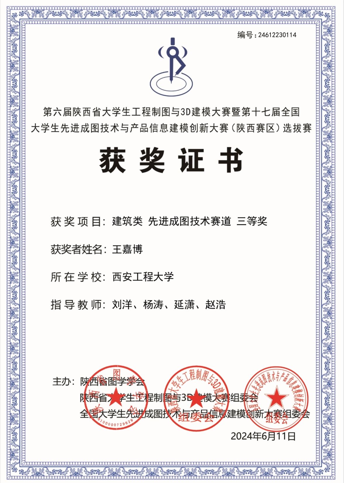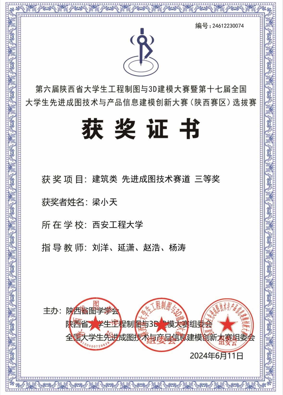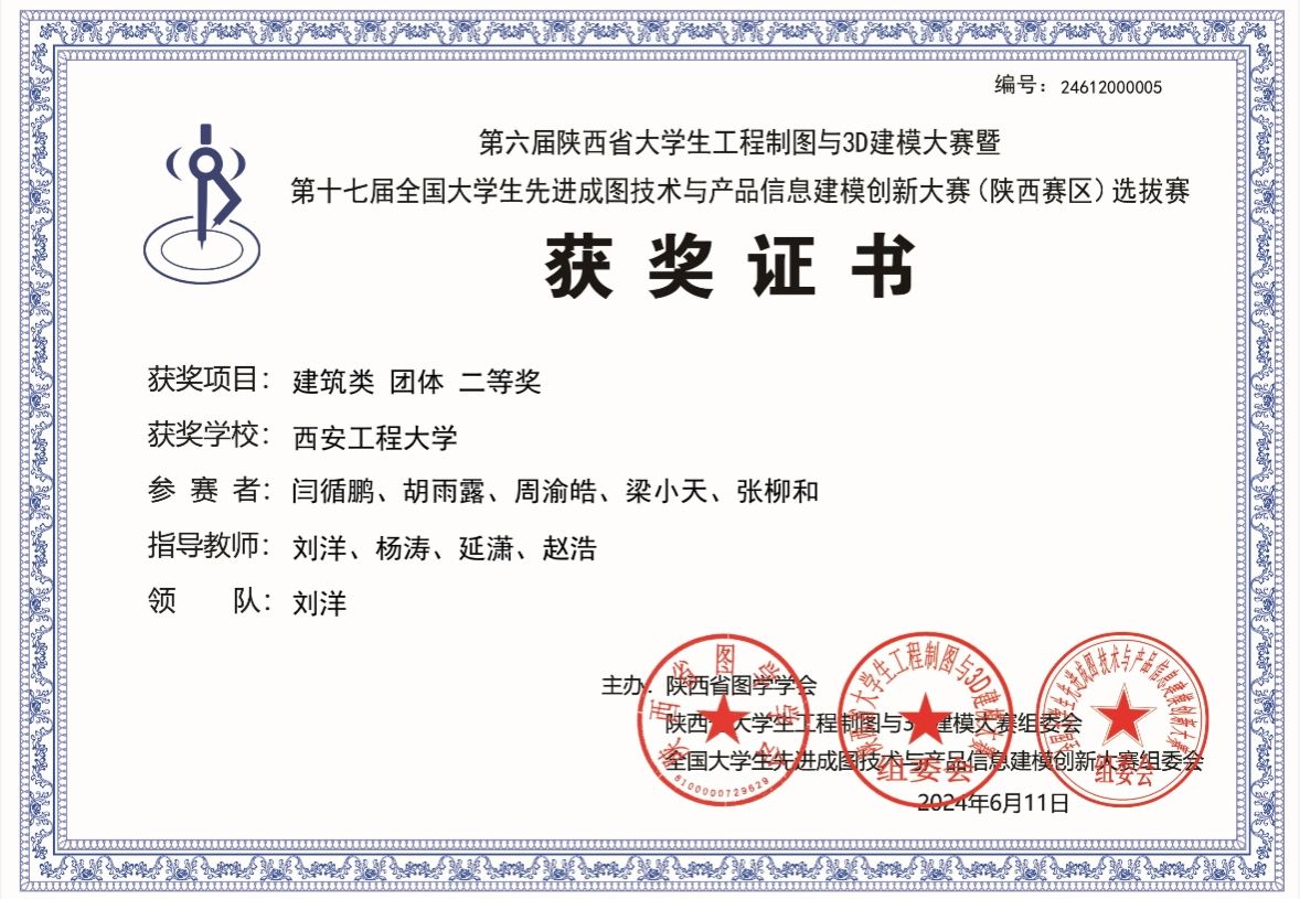 该项比赛自2024年3月在我校启动,经校内培训与初期选拔,推选出1支优秀队伍参加省赛。经激烈角逐,Beat365官方网站学子在陕西省第六届大学生工程制图与3D建模大赛暨第十七届全国大学生先进成图技术与产品信息建模创新大赛(陕西赛区)中荣获建筑类团体二等奖1项,智能建筑结构设计赛道二等奖1项,BIM创新应用赛道并三等奖1项,获得个人一等奖1项,二等奖2项,三等奖4项,并以优异成绩成功晋级全国大赛;指导教师刘洋、杨涛、延潇、赵浩获优秀指导教师二等奖。