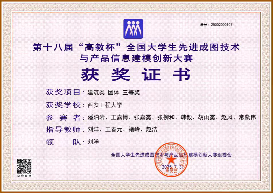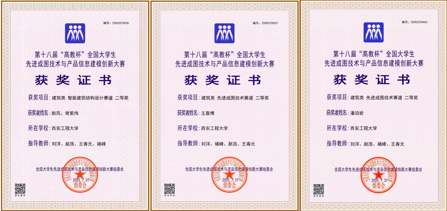 自去年10月开始,经校内培训与初期选拔,Beat365官网指导老师刘洋、赵浩、褚峰、王春元带领Beat365官网11名学生经过激烈角逐,在省赛中荣获获得个人一等奖1项,二等奖1项,三等奖7项,智能建筑结构设计赛道三等奖1项,BIM创新应用赛道建筑类团体三等奖1项。晋级国赛后,22级张柳和、张嘉露、赵风、常紫伟,23级王嘉博、胡雨露、韩毅,24级潘泊岩等8名同学经过艰苦训练和激烈比赛,取得个人二等奖2项,智能建筑结构设计赛道二等奖1项,并获得建筑类团体三等奖1项。
