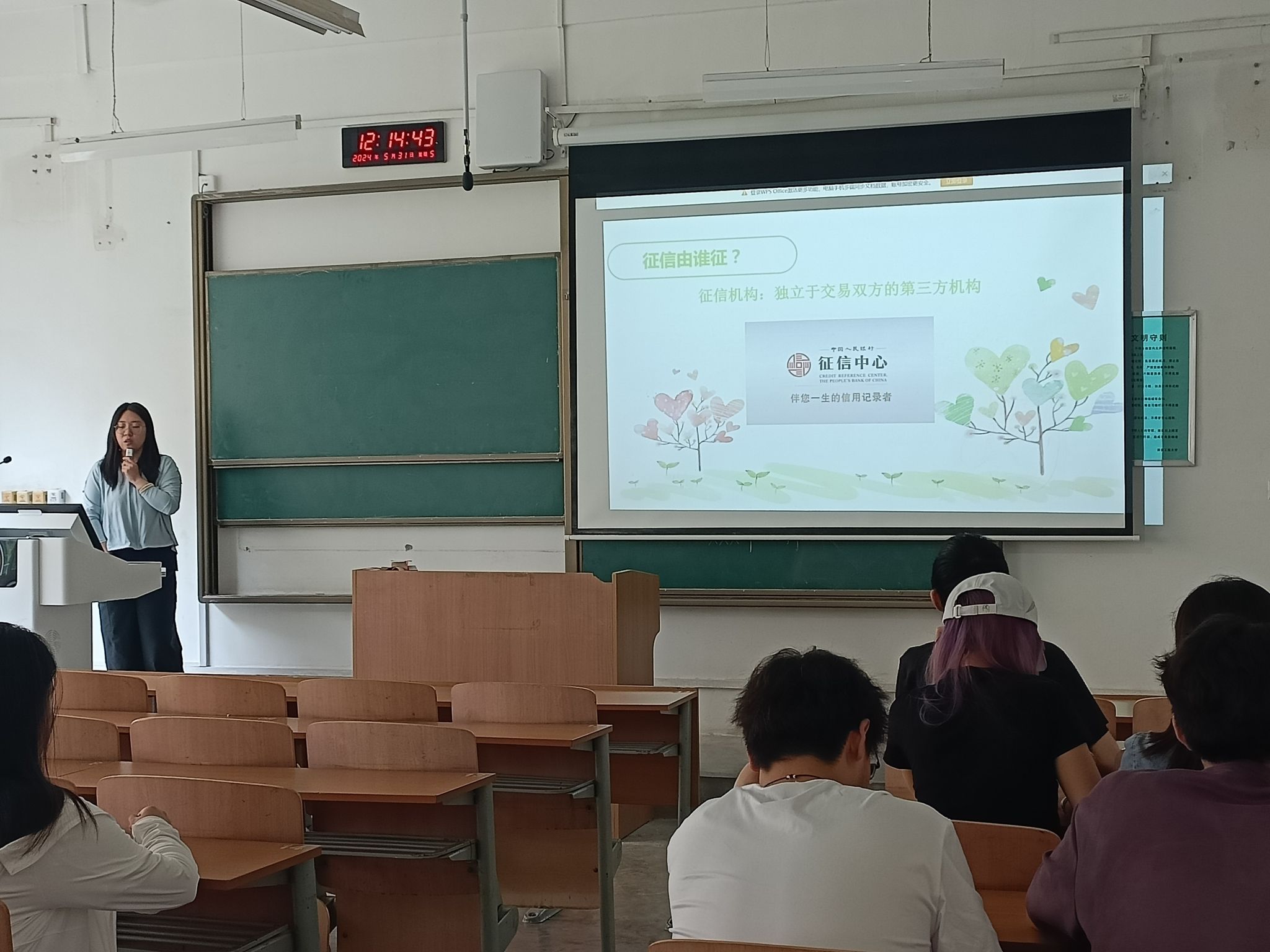首先杜倩向与会学生讲解了生源地贷款的相关政策以及相关的还款流程,解答了同学们关于生源地贷款的相关问题,并提醒大家毕业后务必及时查看还贷情况,不要逾期。之后杜倩进行了诚信还款教育以及征信宣传,督促毕业生关注个人信誉问题,做到及时还款以及个人征信记录完整,力争无不良记录,保持良好个人信用记录。